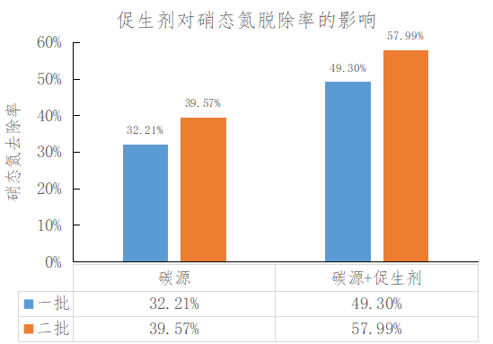 促生劑對反硝化脫氮的促進作用:以某廠化工污水生化處理過程中的脫氮效果為例,添加水體十萬分之一的促生劑能夠提升17.09%-18.42%的硝態氮脫除率。