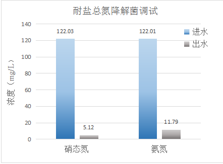 糧果廢水鹽度2%,30℃下經過我司耐鹽總氮降解菌的生物調試后,硝態(tài)氮的去除率超過95%、氨氮的去除率超過90%。